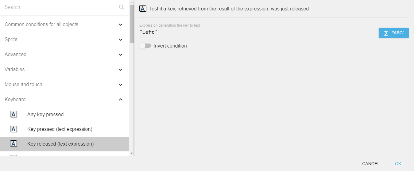To test a key press using this condition, you need to enter the key name in the form of text expression. For example, if you want to check condition for left arrow key press, you need to enter "Left" in the field.