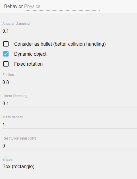 To add physics behavior to an object, open the object properties by right clicking on the created object in the Objects Editor. Then, select "Edit object" from the popup list that appears. Finally, select the Behaviors tab and click the "add behavior" button. Choose the "Physics engine":