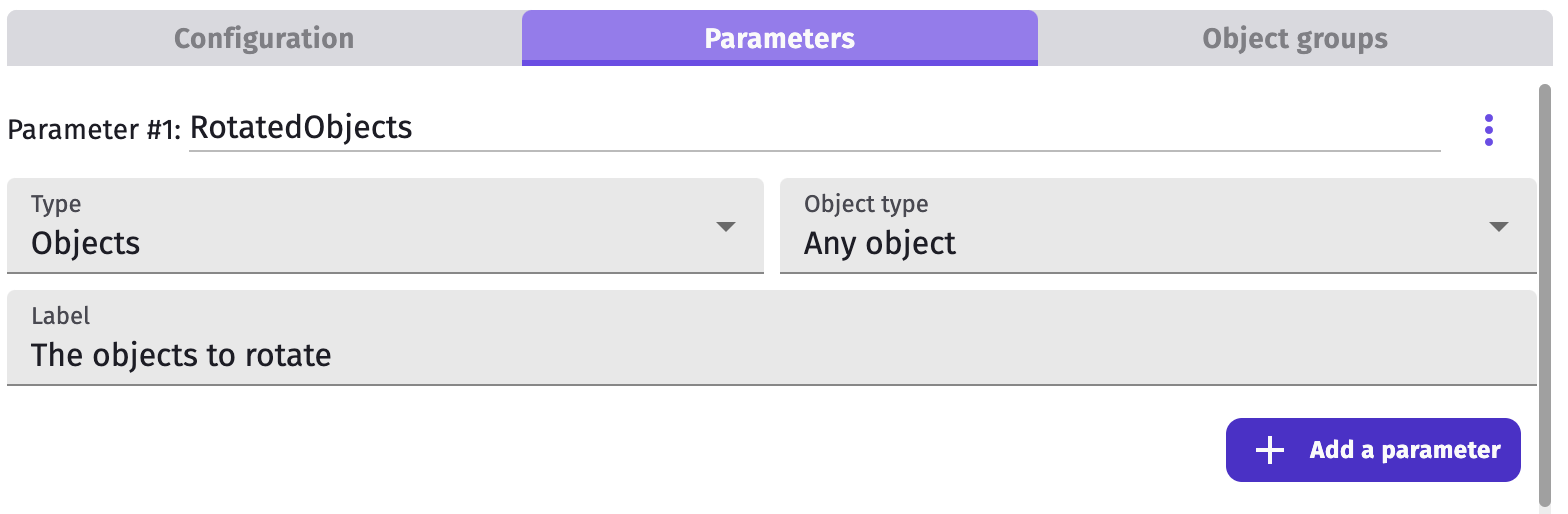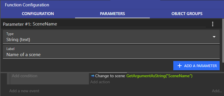 In addition to events, functions also have parameters, just like usual conditions, actions and expressions. The parameters can be objects, number or text.