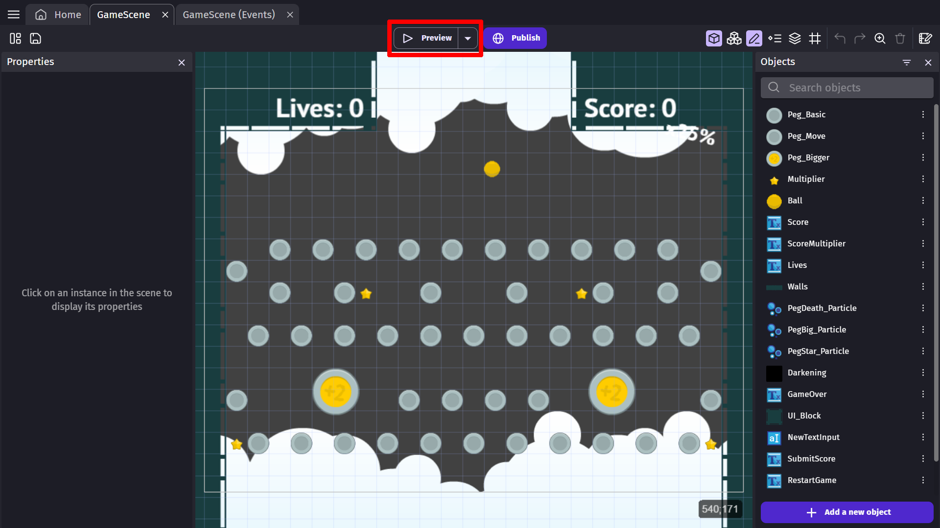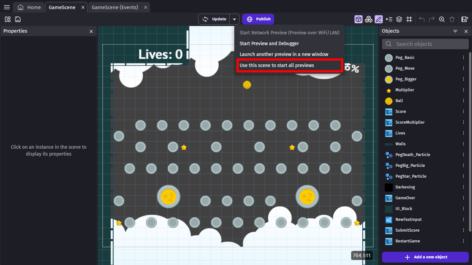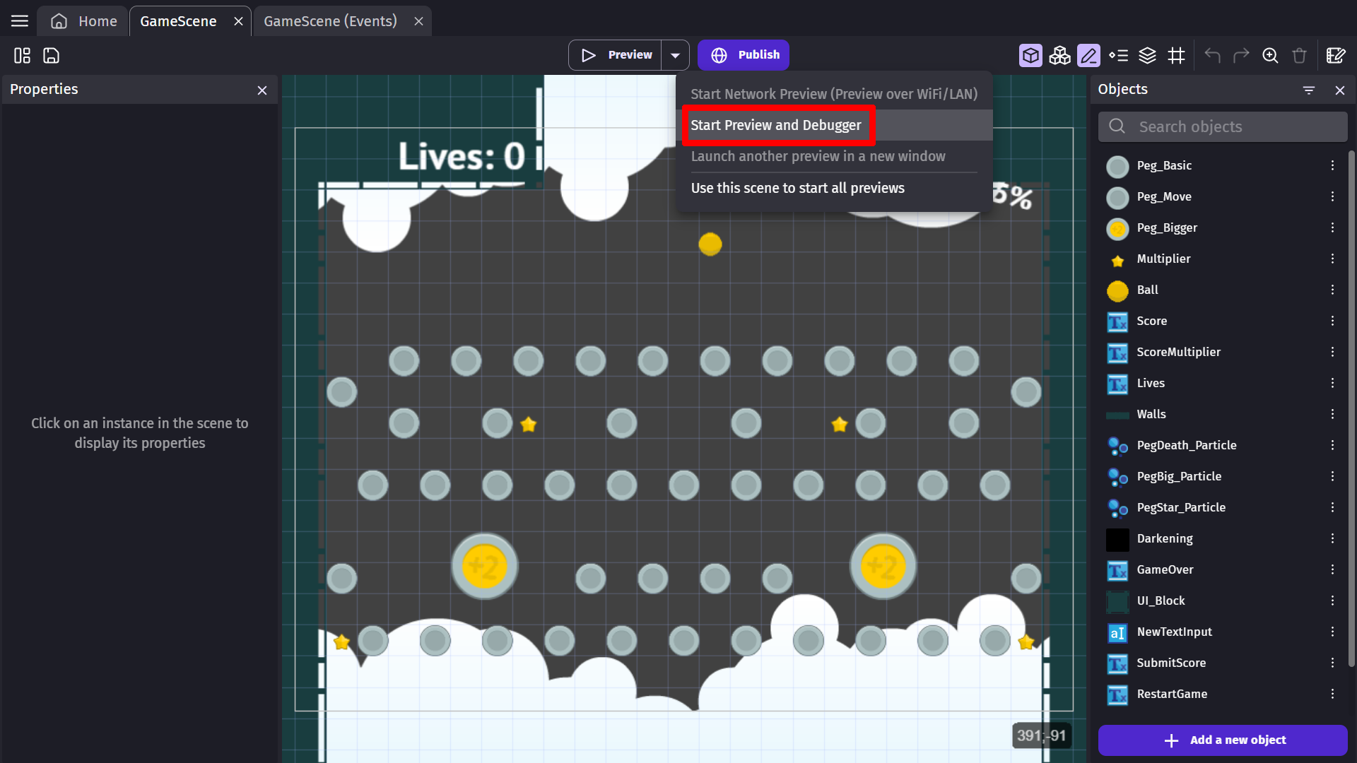 This is especially useful when you want to do some tweaks to your game, like changing the parameters of effects or the properties of the behavior of an object, and see the result immediately. It's also useful to check how your events are working without restarting your preview from the beginning.