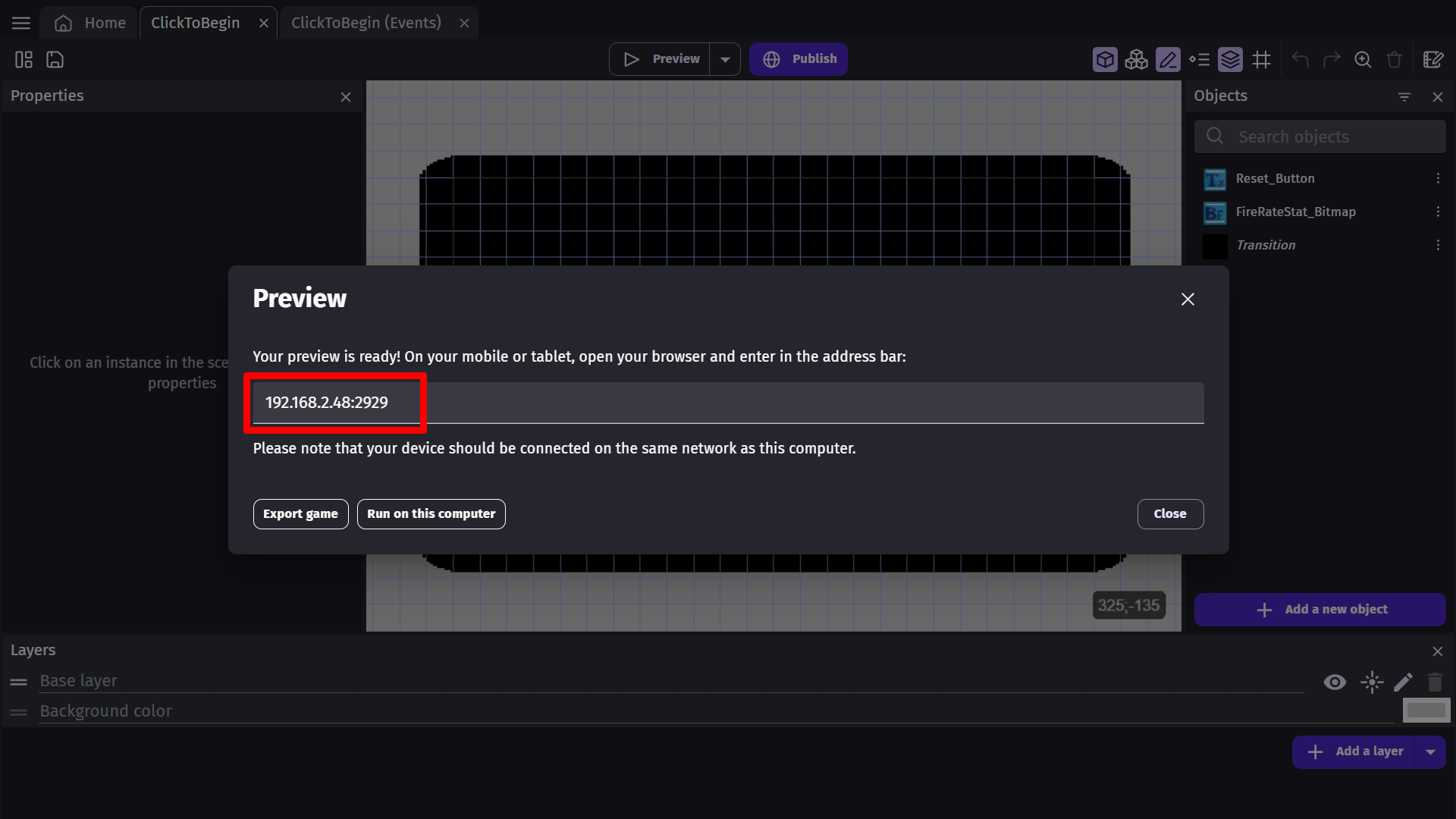 You can now close the pop-up window in the editor and continue to edit your game. When you click on the button to apply the changes to the preview, all the previews running on your computer, other computers or tablet/phones will be updated.