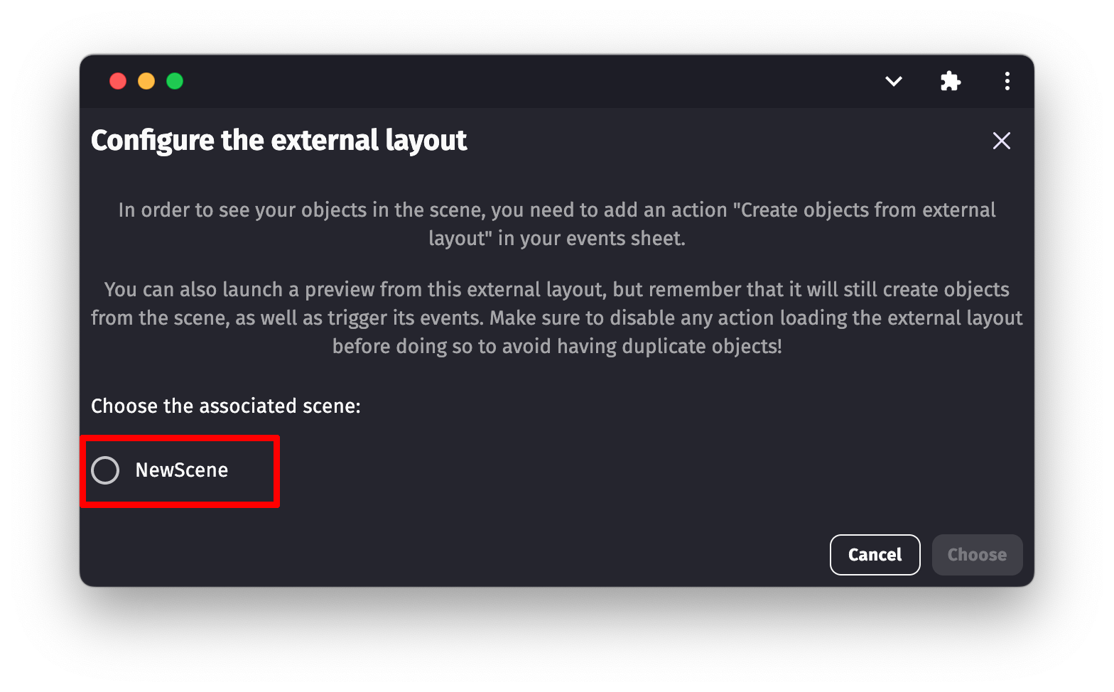 If you use this action, make sure to run it with either the At the beginning of the scene or Trigger once condition. Otherwise, new objects from this external layout will be created every frame, which will drastically reduce performance and create too many objects.