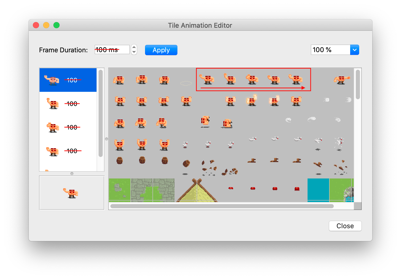 In GDevelop, you can choose the speed of the animation(s) of the Tilemap, which is by default 4 FPS (4 images per second, which means 1000/4 = 250ms between each image):