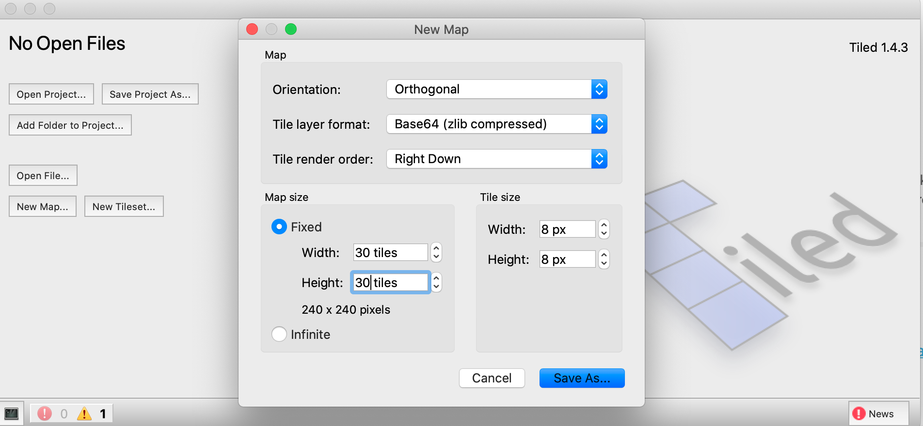 • Maps made in tiled must have a fixed size. Tilemaps set to "Infinite" will not function.