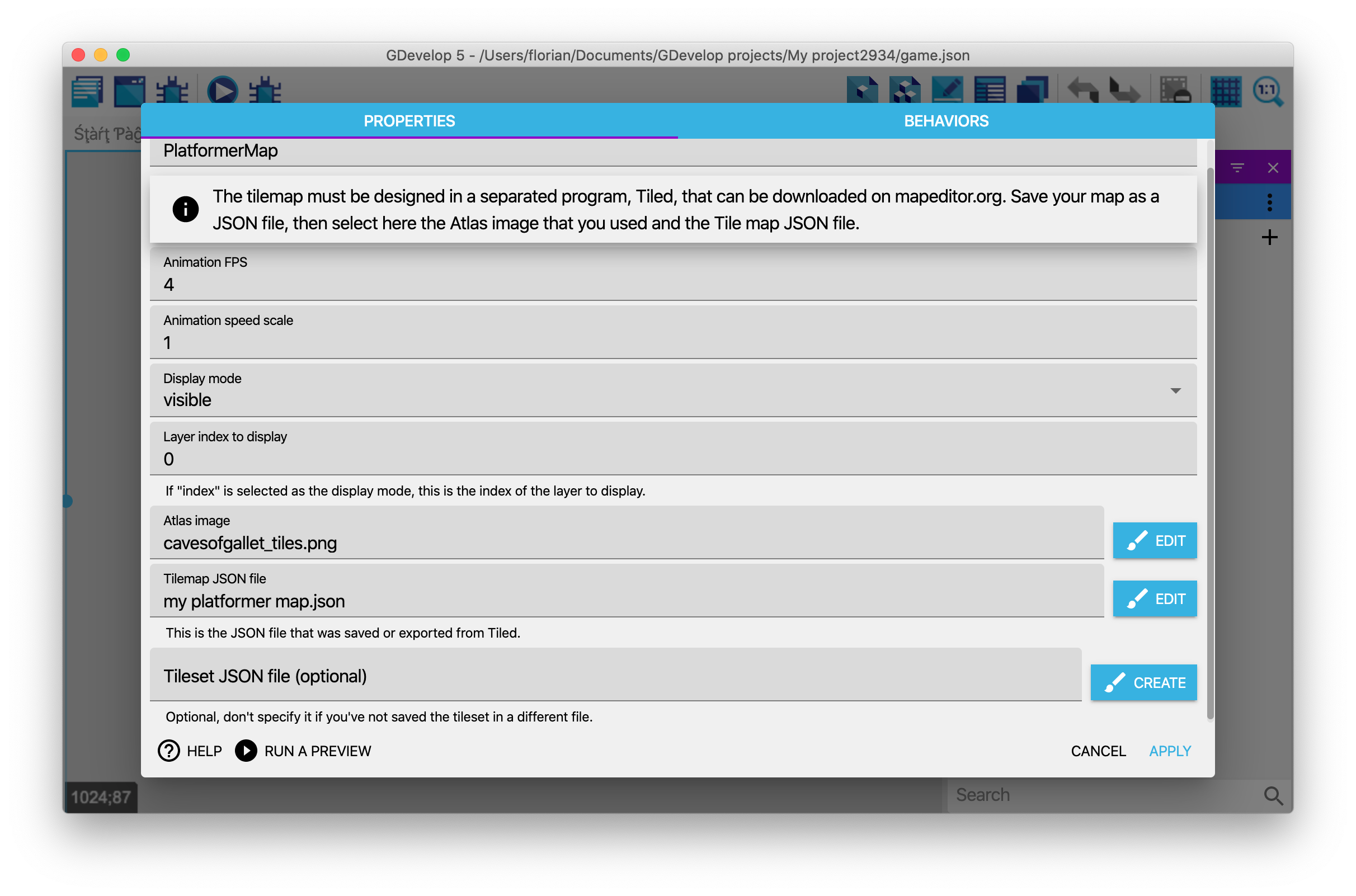 Finally, to display the map in GDevelop, choose to create a new Tilemap object. Then configure it by choosing your Atlas image (the image containing the tiles) and the Tilemap JSON file: