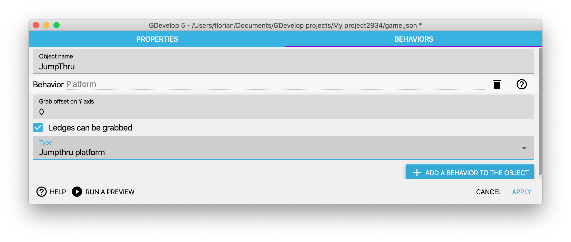 A platformer game often needs different kind of objects like platforms, jumpthru or ladders. One collision mask should be created for each kind. The example in the following screenshots can be opened in the online editor (open the project).