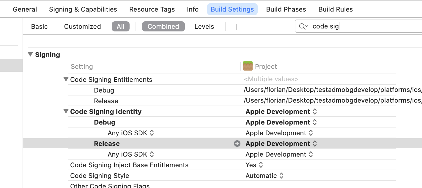 • To test on an iOS device, it's recommended to launch XCode and open your project (open platforms/ios/YourProject.xcworkspace). You'll need to set up a "Development Team" and choose your device. This is because each device must be added to your "Development Team" before it can run development applications.