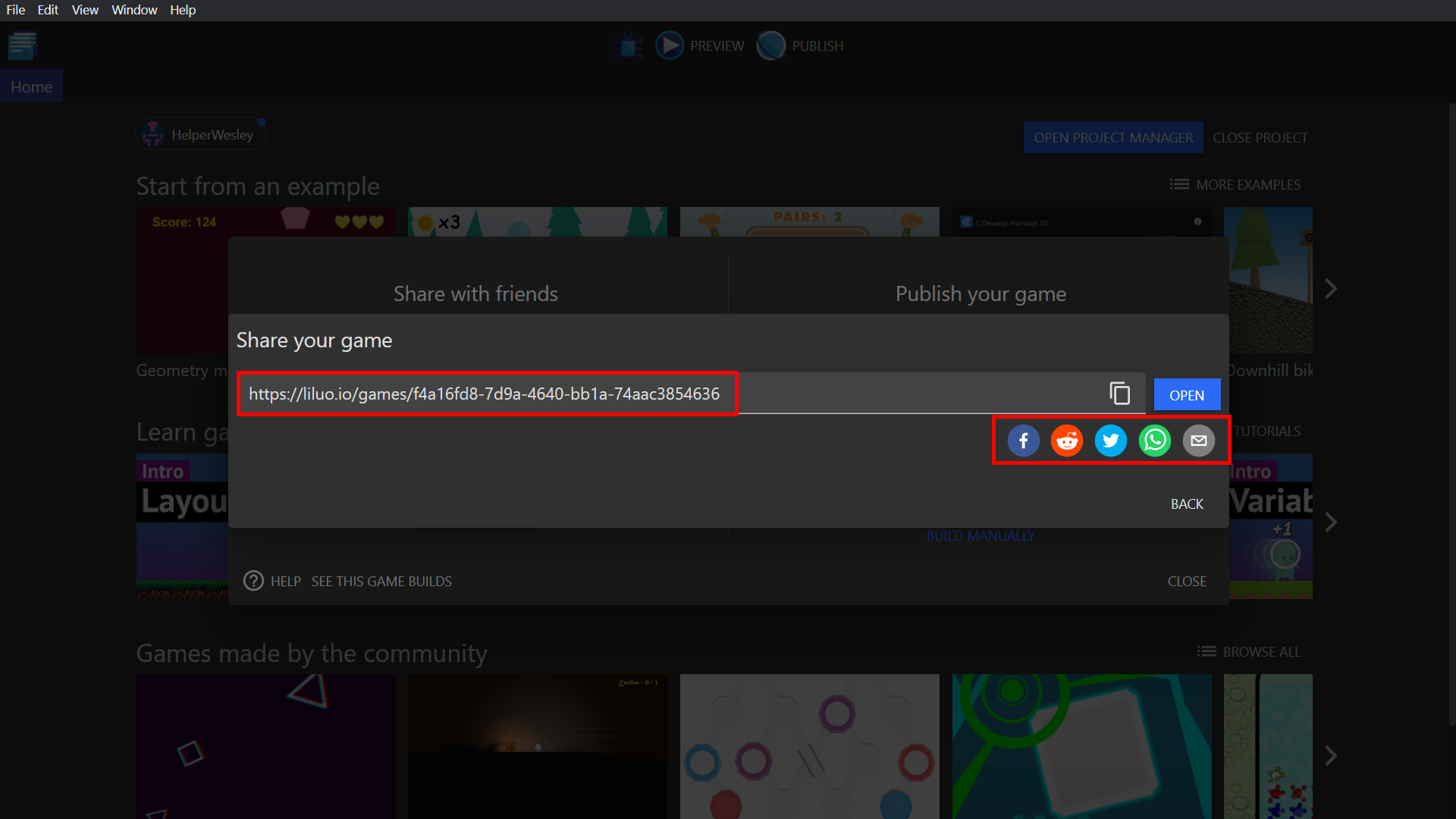 From here you are given a new link and some new options for sharing your game through social media.