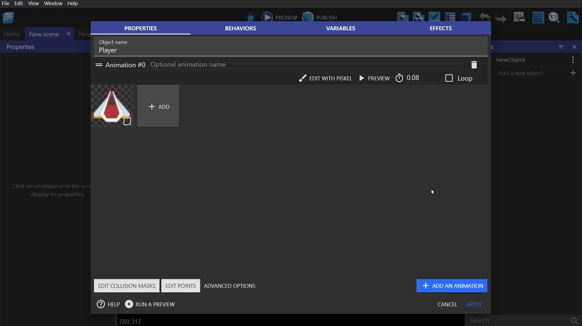 Next, edit the Player object's origin point from the Edit points screen. Drag the origin to the center of the object, so that when we apply a force to the object it will be applied at this point.