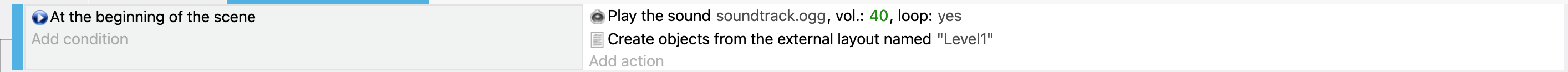 Open the events tab, and add a new action under the At the beginning of the scene event. Select Create objects from external layout and enter the name of our external layout, in that case, Level1.