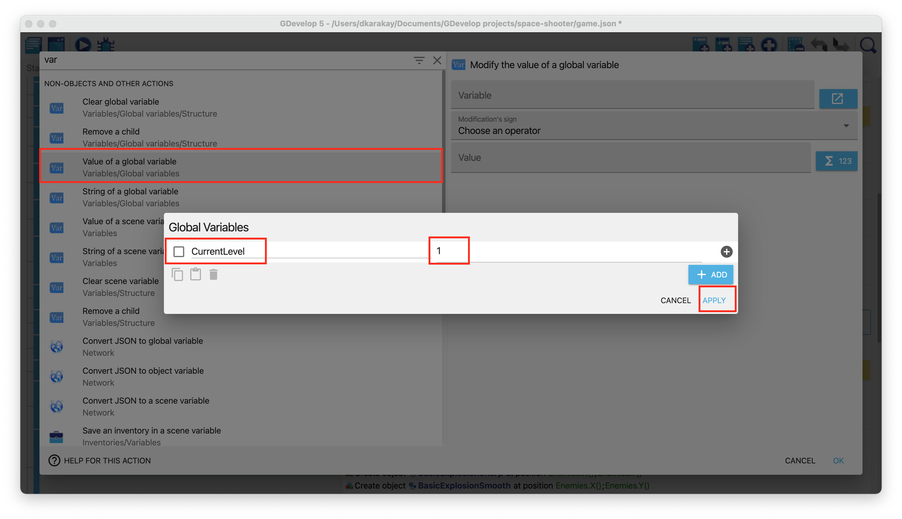 Open the Events tab, and add a new condition to determine the collision between Player and FinishLine. Then, create a new global variable called CurrentLevel and set to 1.