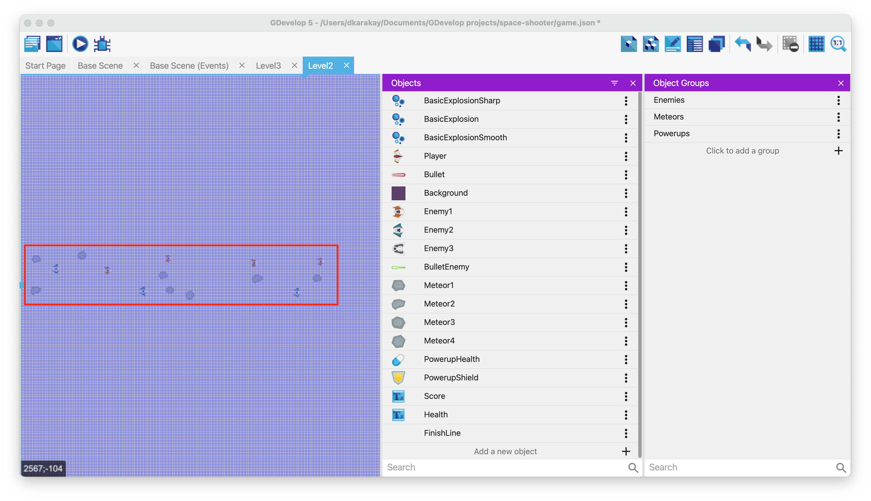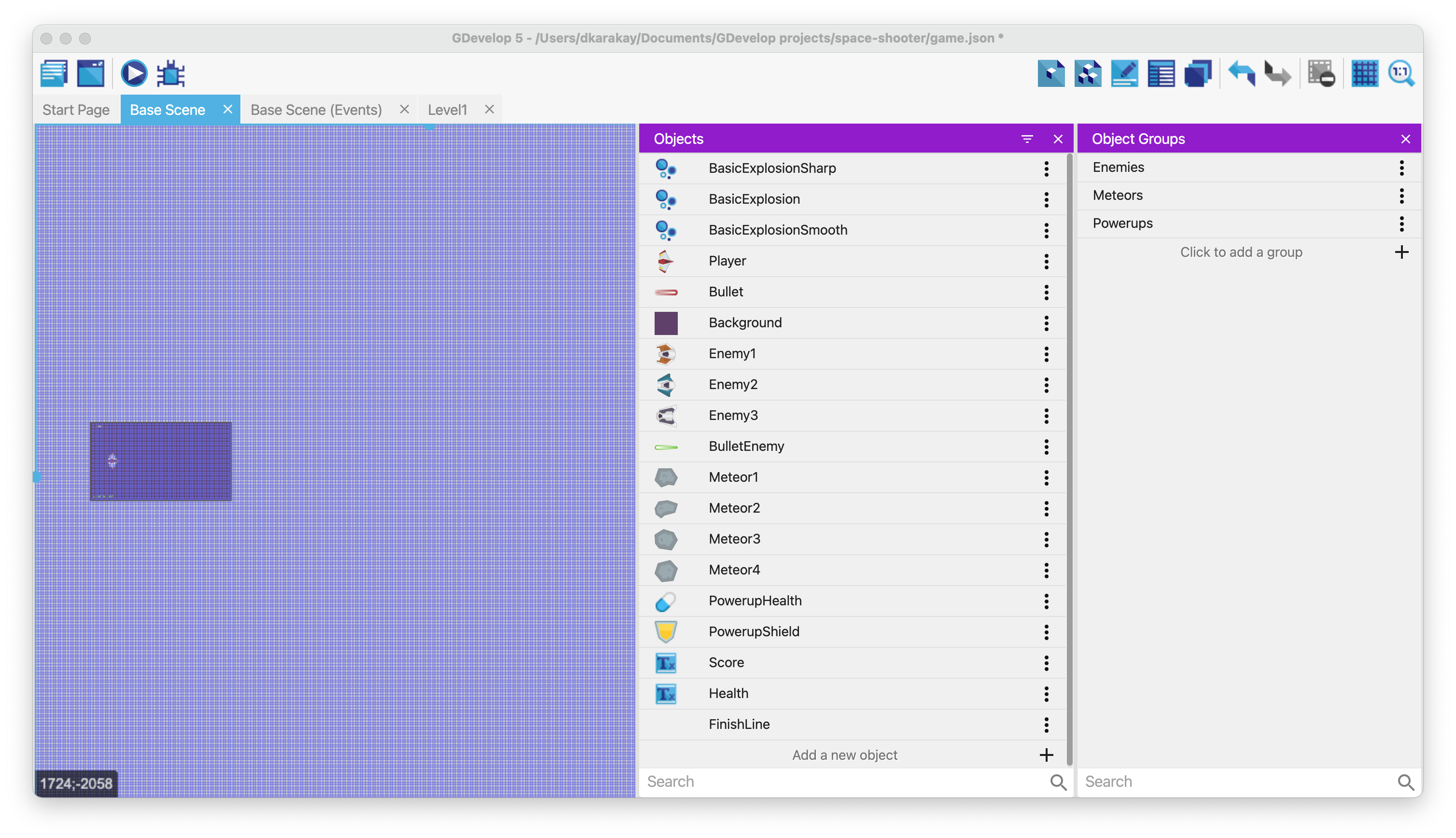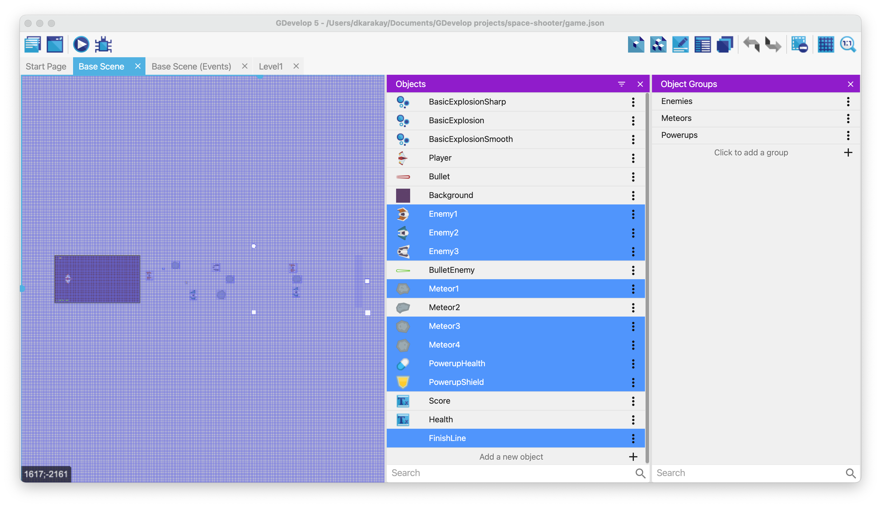 Now, we should go back to the Base Scene and delete all enemies, powerups, meteors, and the finish line. We will add those objects and set up our levels in the external layouts.