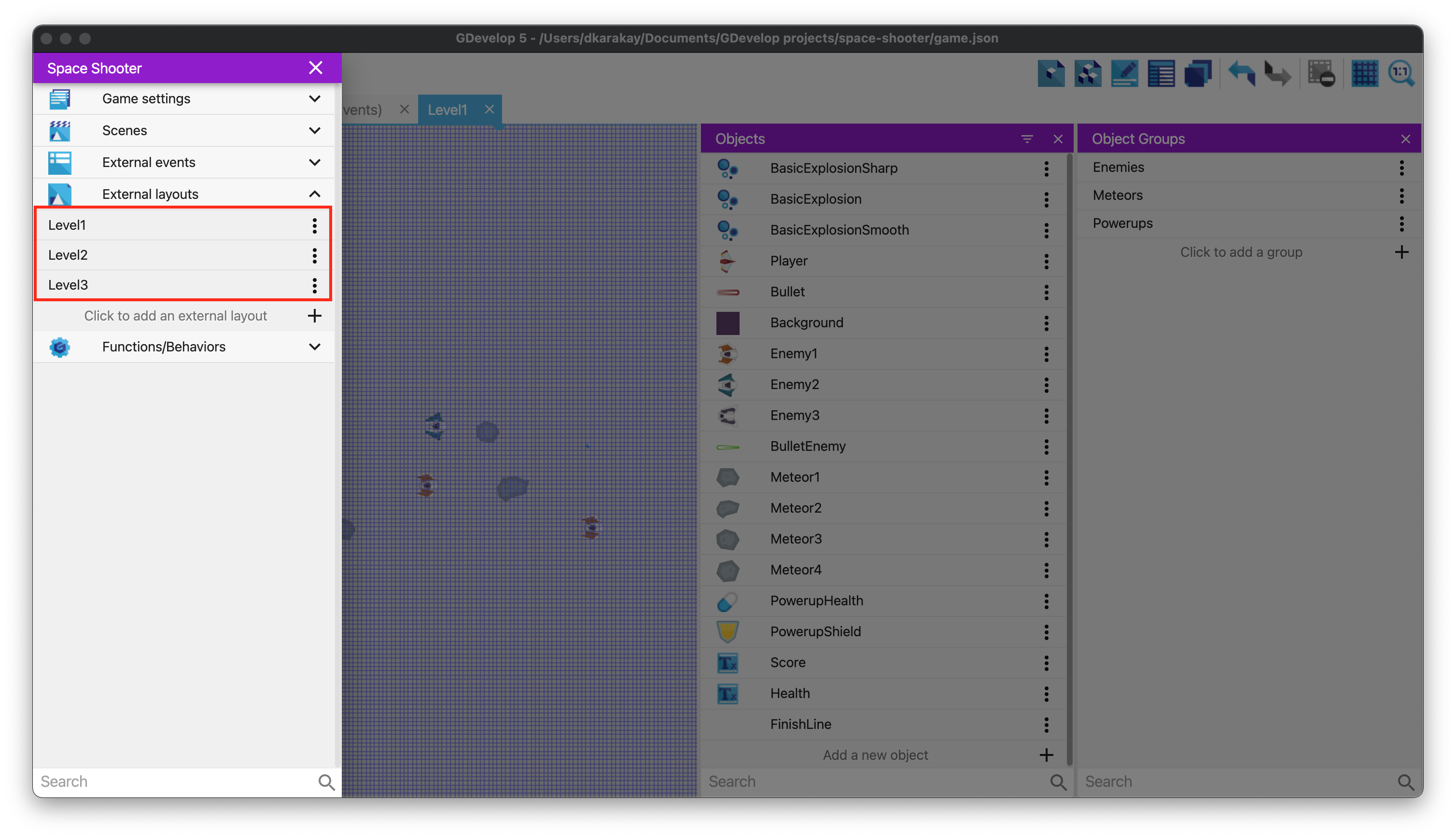 We can now go back to our external layout and design our level by dragging and dropping the objects.