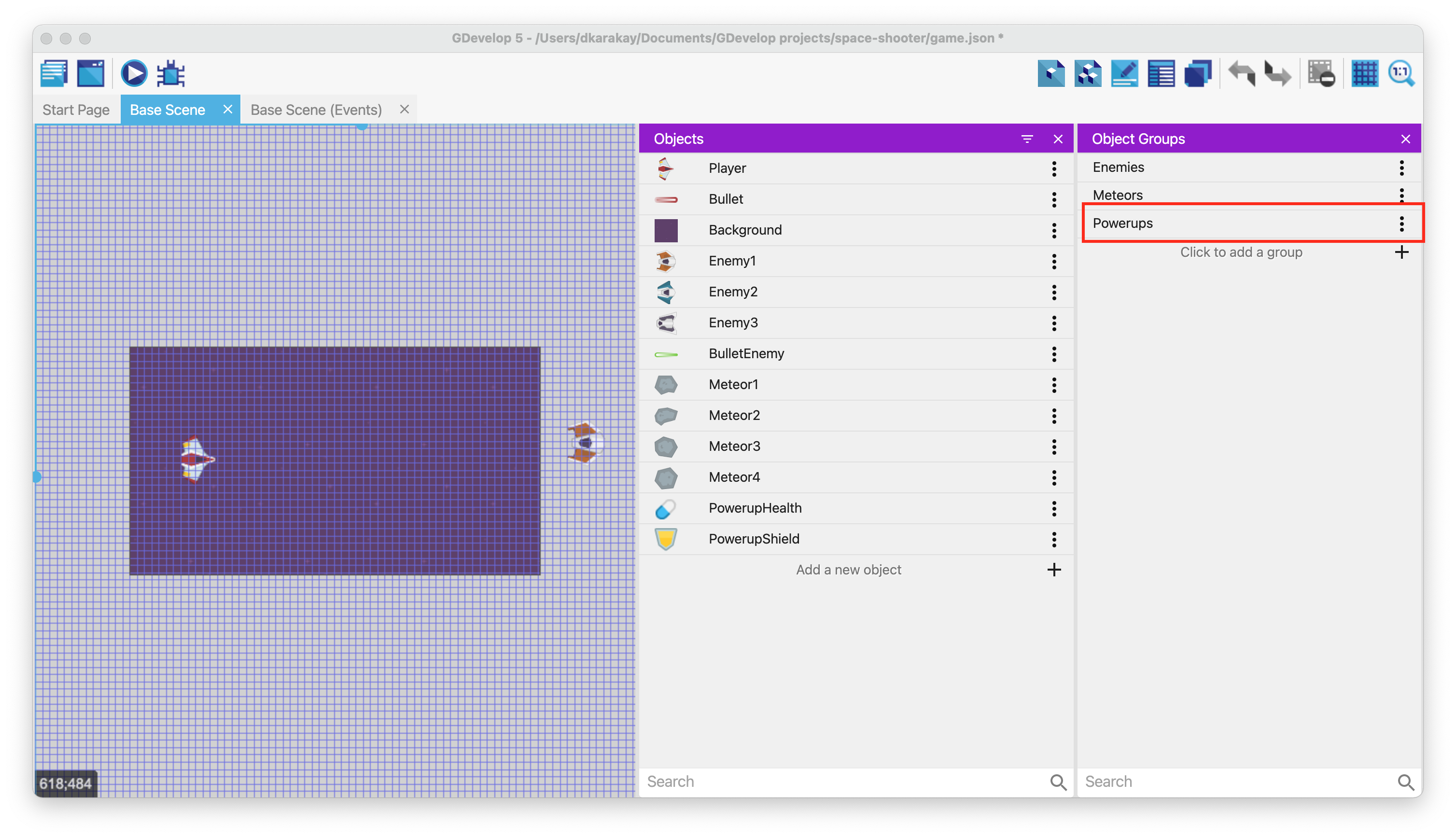 We will add two objects called "PowerupHealth" and "PowerupShield." Select the "powerup_health.png" image from the assets folder for the health object. Repeat the same process for shield object by choosing the "powerup_shield.png" image. In the end, you should see: