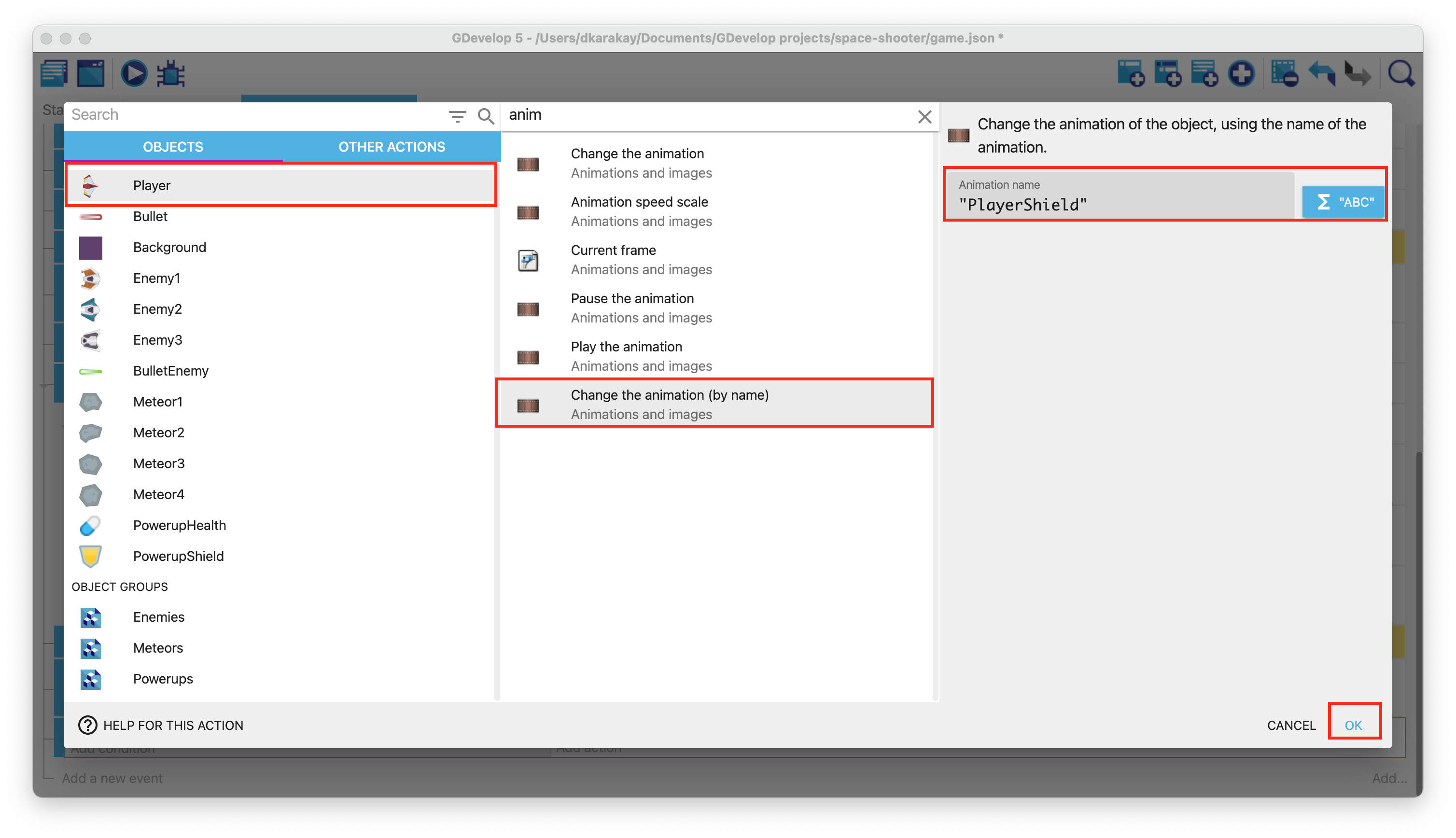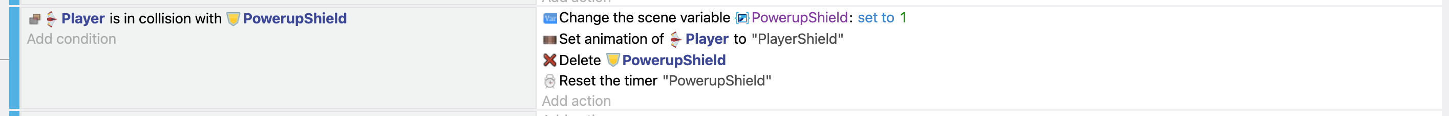 Create a new condition for detecting the collision between the Player and the PowerupShield objects. Then, add an action to change the animation of the player. Select Player, and choose "Change the animation (by name)" and enter "PlayerShield" in the name field.