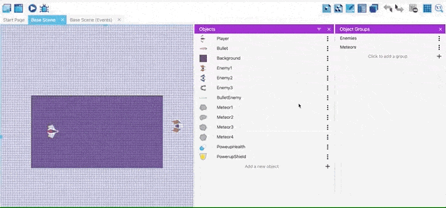 We are ready to open the "Events" page. We will add a new condition to check the collision between the Player and the PowerupHealth objects. If the collision happens, we want to increase the player's health by 30 and delete the powerup object since we do not need it anymore.