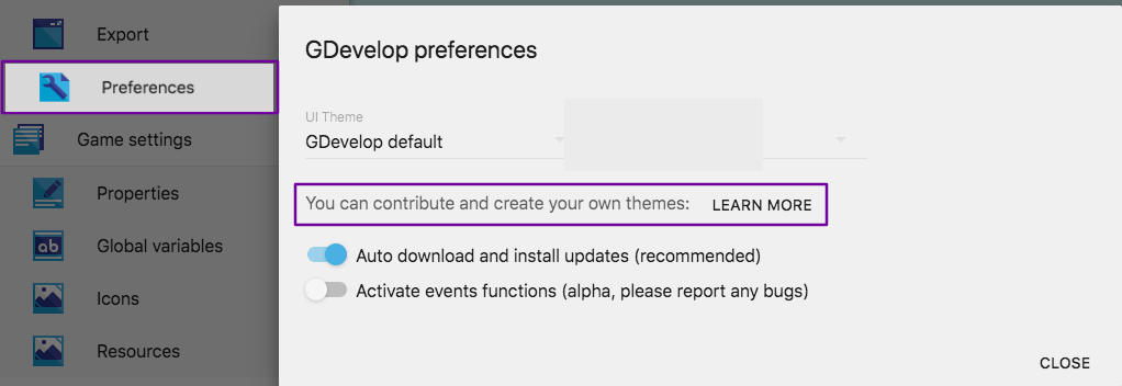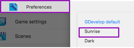 export const getTheme = themeName => themes[themeName] || themes['GDevelop default']; ` Now, when you run GDevelop, you will see your new theme referenced in "Preferences": For additional information check out the link that is included in GDevelop: