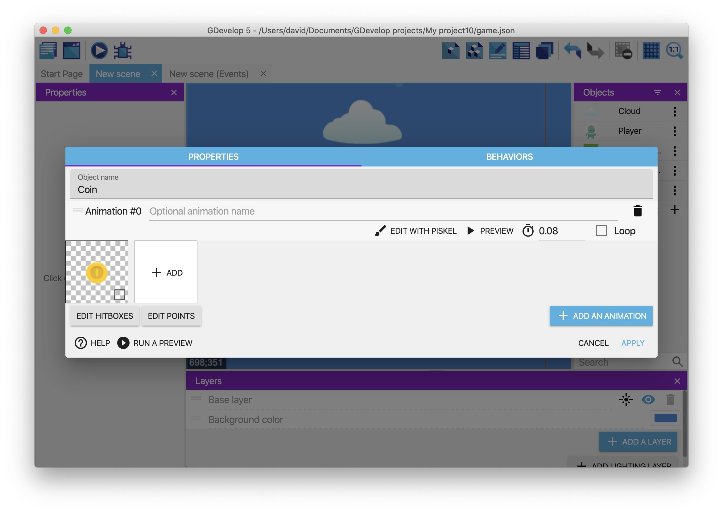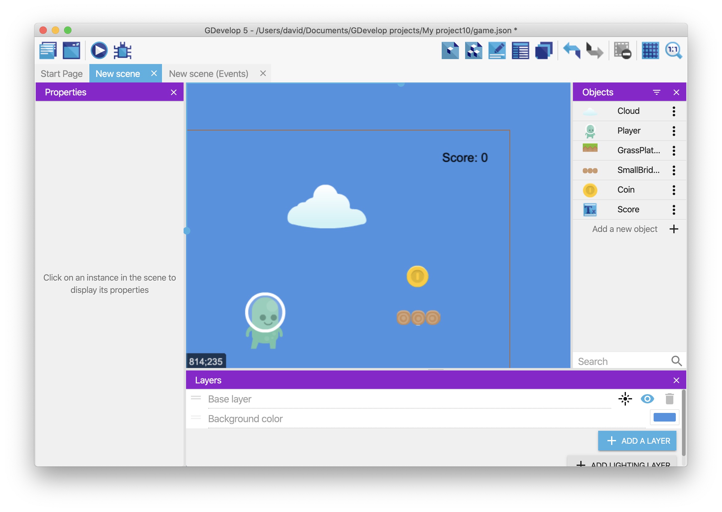 De eerste stap is om een munt te maken die de speler kan verzamelen. Je kunt deze stap in twee delen splitsen: een object voor de munt maken en de munt vervolgens verzamelbaar maken door een event te gebruiken om te kijken wanneer de speler ermee in botst.