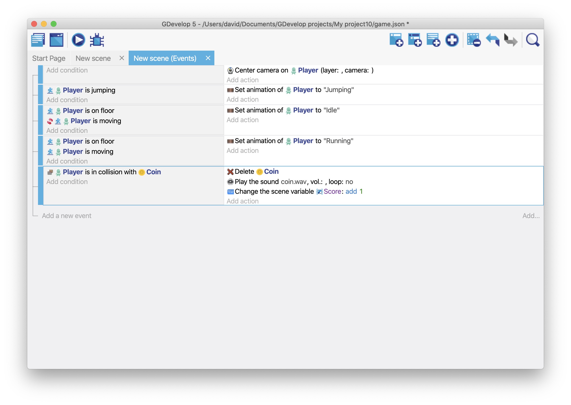 - Voeg een Collision conditie toe aan het event die kijkt of het "Player" object botst met het "Coin" object.