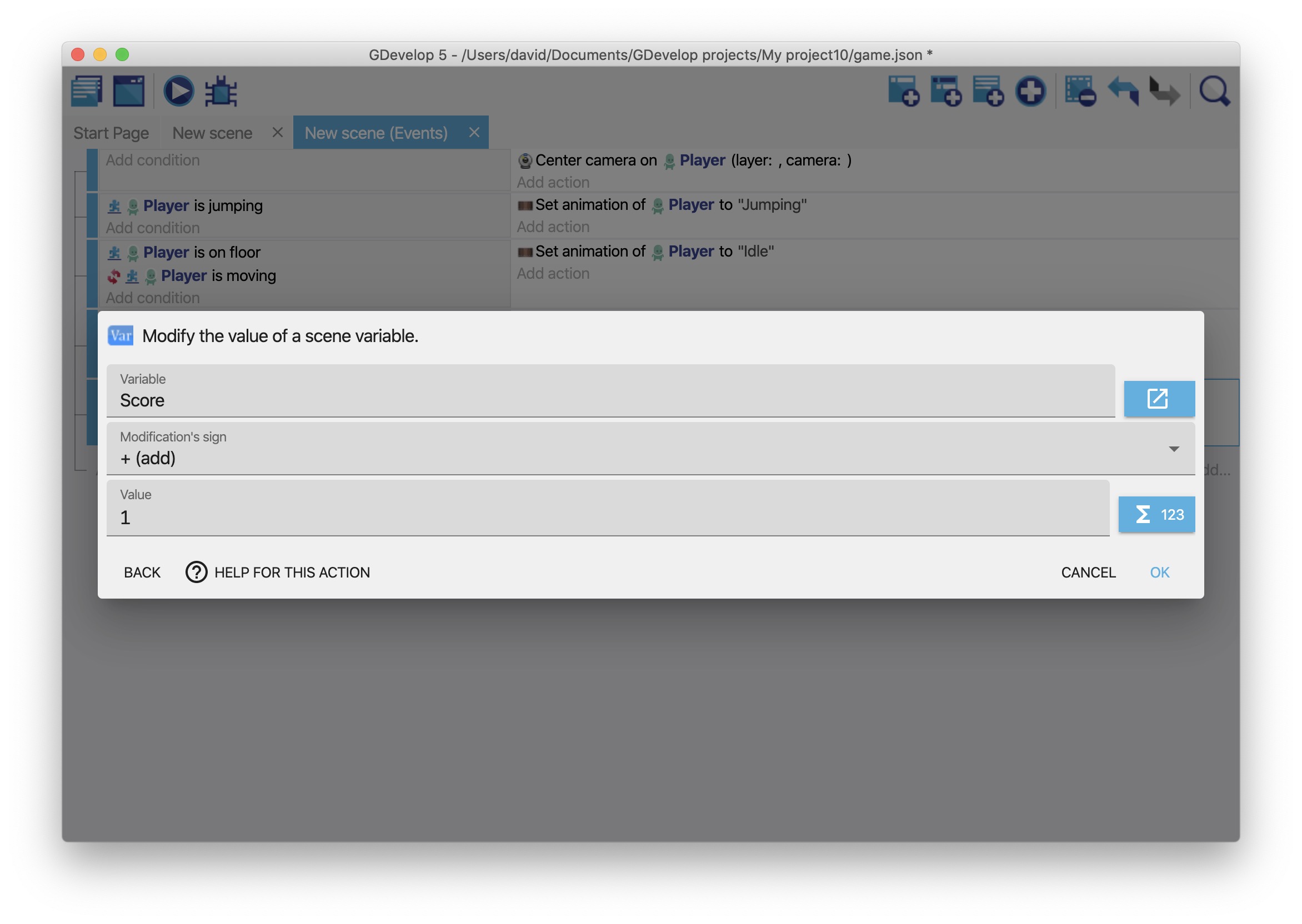 - Voeg een Value of a scene variable actie toe aan het eerder toegevoegde event.