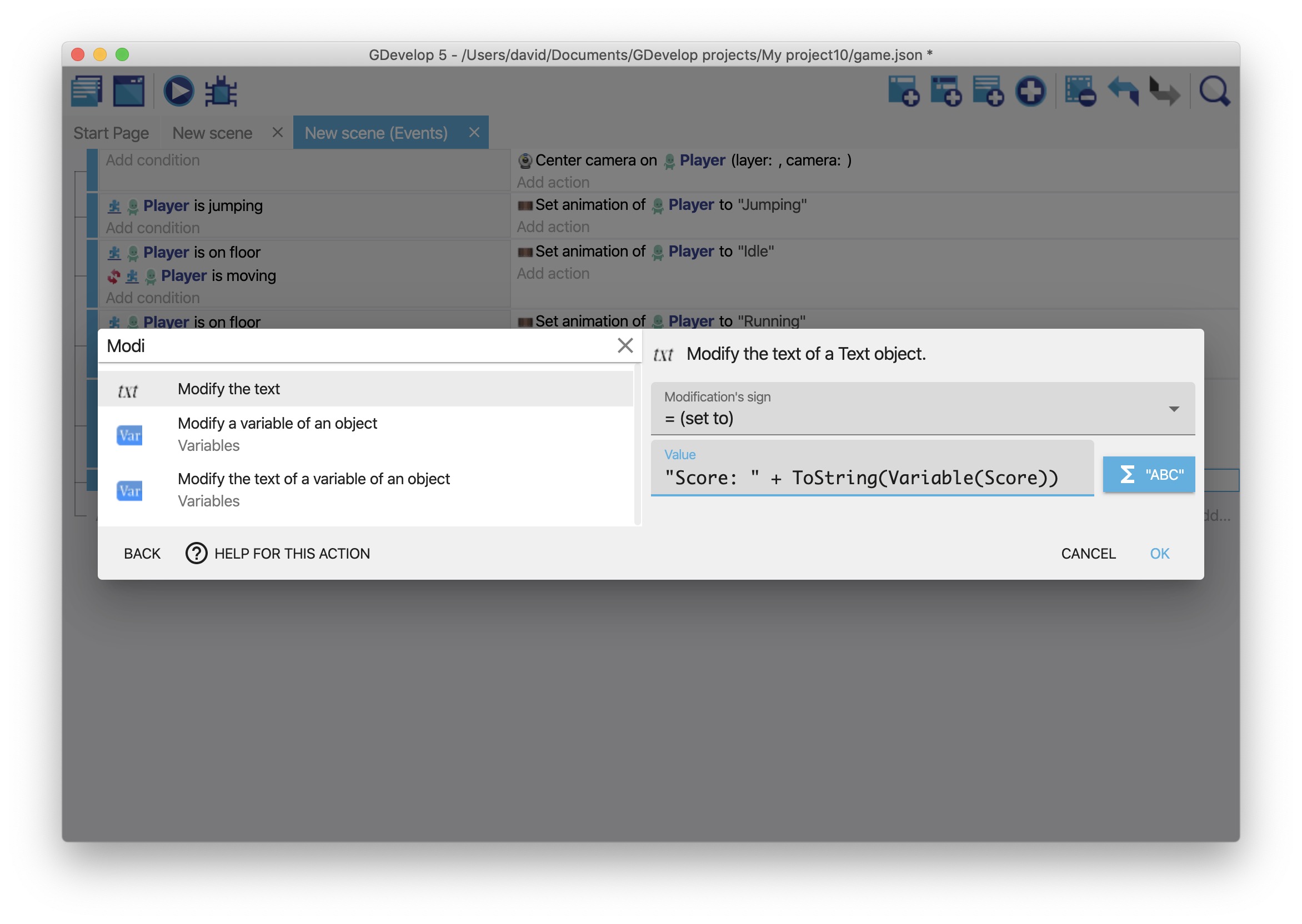 - Voeg de Modify the text actie toe aan het "Score" object zonder een conditie aan toe te voegen. Wanneer je geen conditie opgeeft wordt de actie elk frame uitgevoerd. Hiermee zorg je ervoor dat altijd de juiste score op het scherm staat.