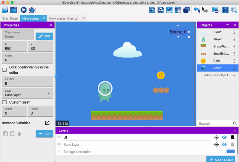 Om het aantal verzamelde munten te laten zien heeft de game een object nodig dat de tekst laat zien en een event dat de waarde van deze tekst bijwerkt.
